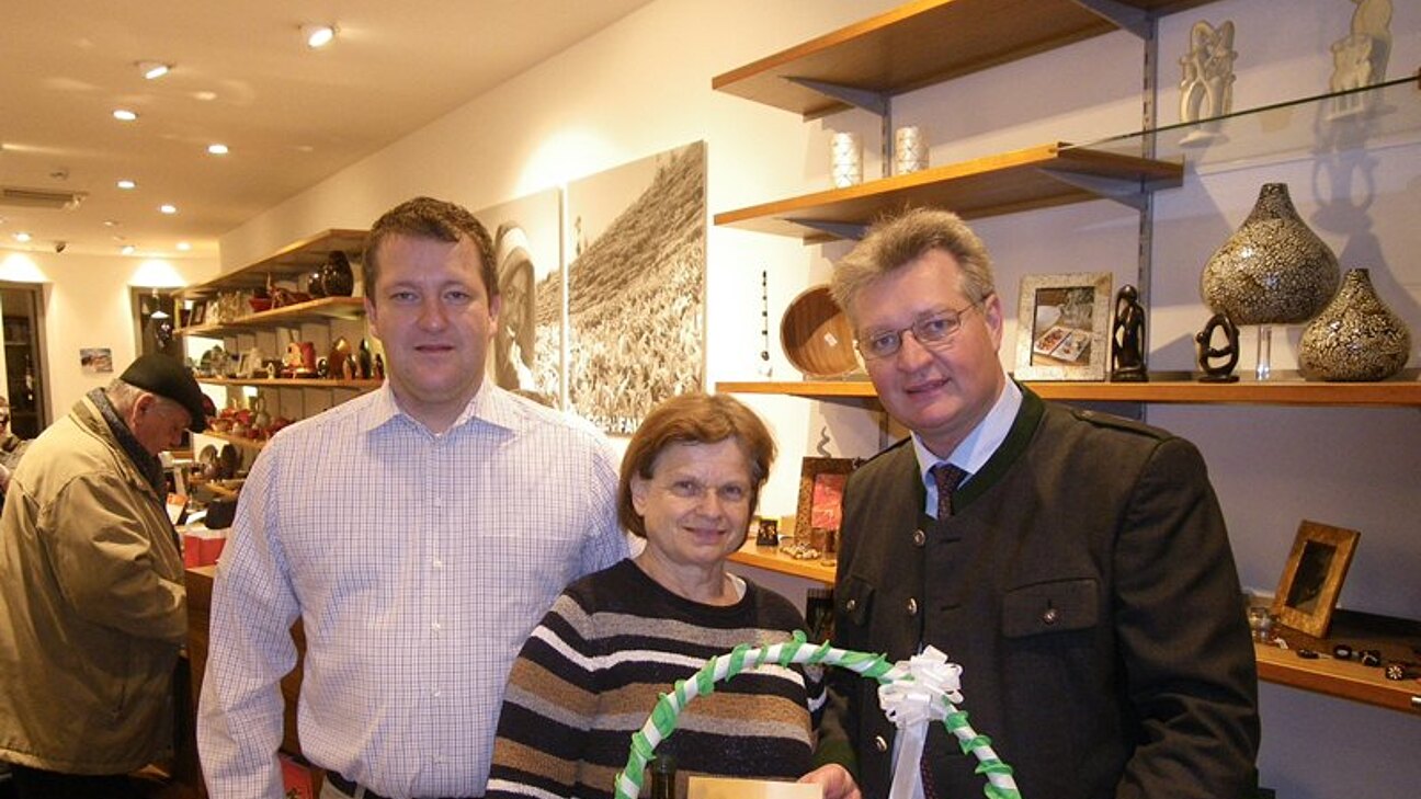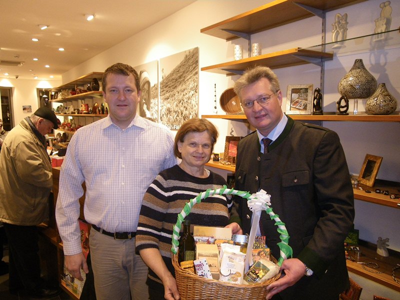 Die Leiterin des Pfaffstättner Arbeitskreises "Fair Trade" Anneliese Paschen feierte ihren 65. Geburtstag. Bgm. Christoph Kainz und Umweltgemeinderat Viktor Paar kamen zum Gratulieren extra in den Welt Laden in Baden, wo Anneliese Paschen regelmäßig Dienst versieht und übergaben ihr einen Geschenkkorb der Marktgemeinde Pfaffstätten - natürlich gefüllt mit Fair Trade Produkten. Bgm Kainz: "Frau Anneliese Paschen setzt sich schon seit vielen Jahren für Fair Trade Anliegen ein. Dafür möchte ich ihr im Namen der Fair Trade Gemeinde Pfaffstätten ganz herzlich danken!"