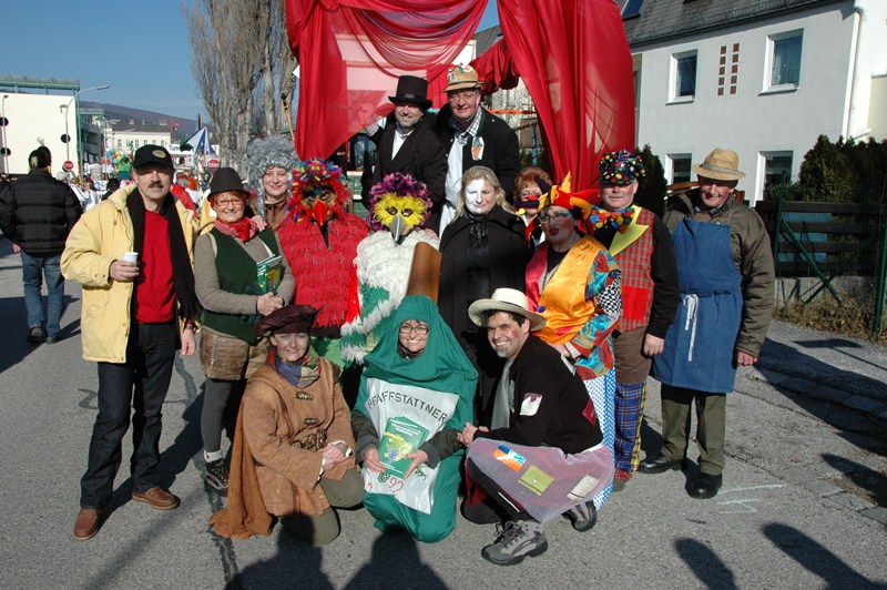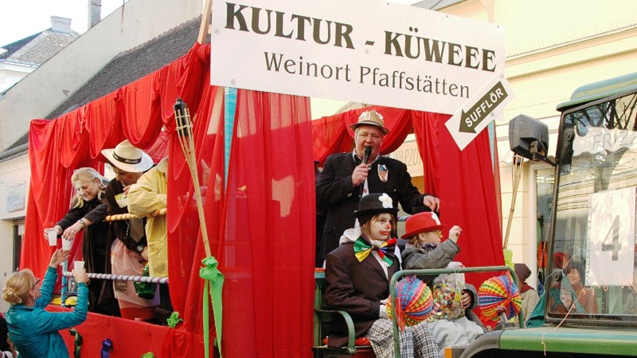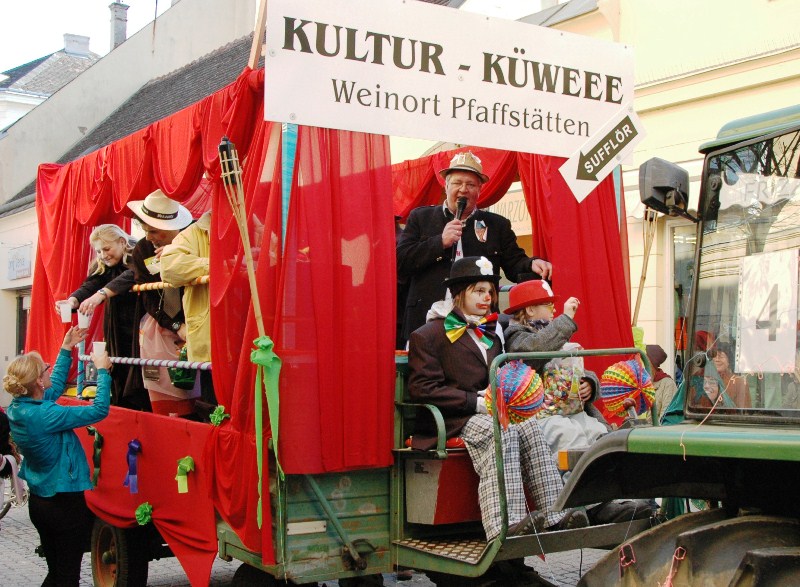 Der Pfaffstättner Fremdenverkehrsverein setzte sich wie jedes auch heuer wieder beim Badener Faschingsumzug groß in Szene. Mit dabei Bürgermeister Kainz, der fleißig für den Pfaffstättner Kultur-Cuvee die Werbetrommel rührte.